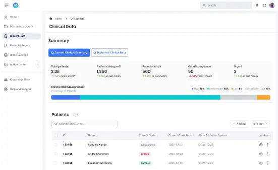 Too often, organizations only discover performance gaps that lead to unsatisfactory outcomes when it's too late to intervene. KlearTrust changes this by embedding advanced contract logic into live patient data streams, capturing events, interpreting signals, and reacting to changes in patient state. This transforms value-based partnerships from passive risks into actively managed programs.